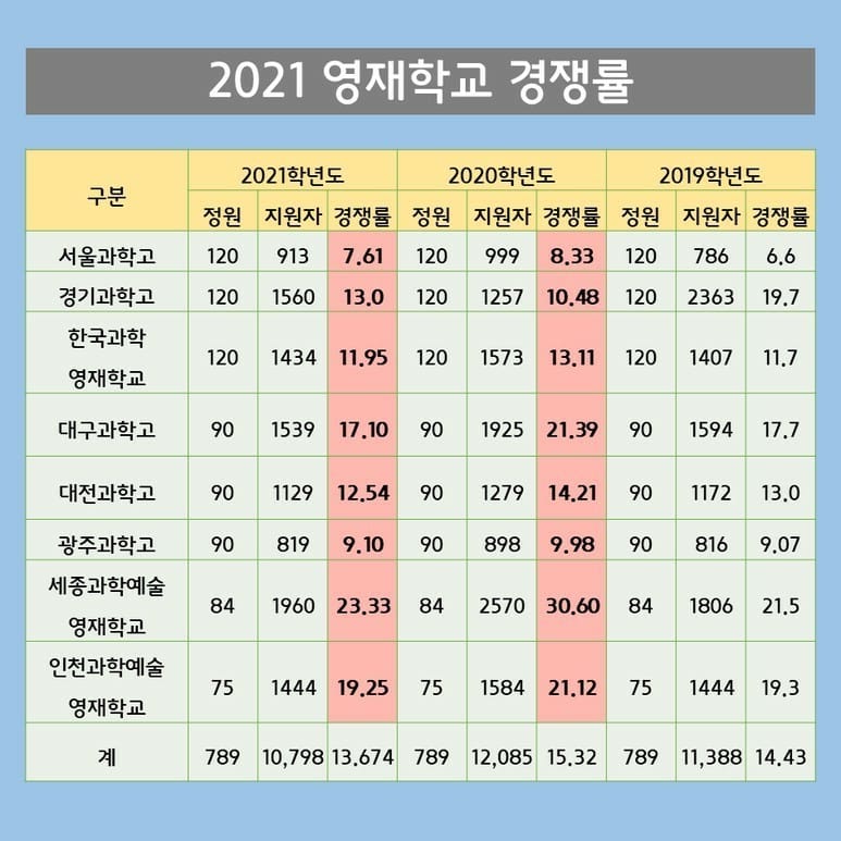 2021년 과학고등학교 및 영재학교 경쟁률